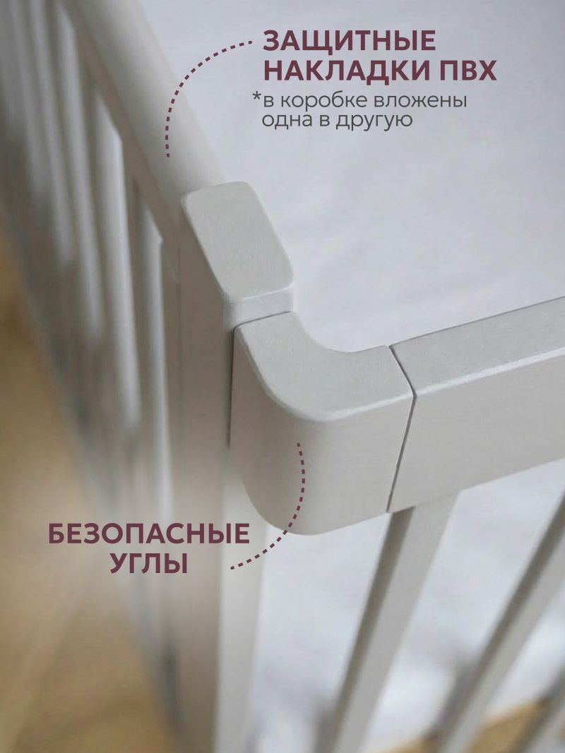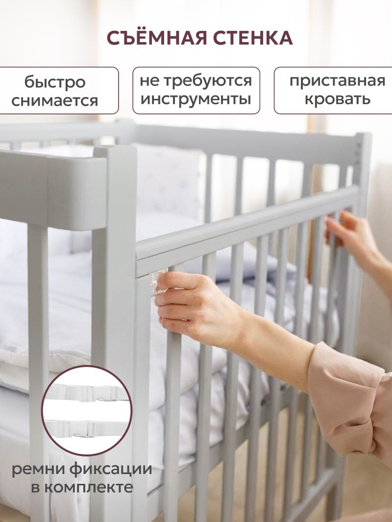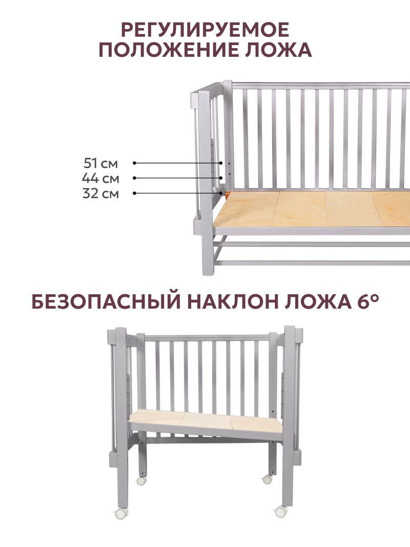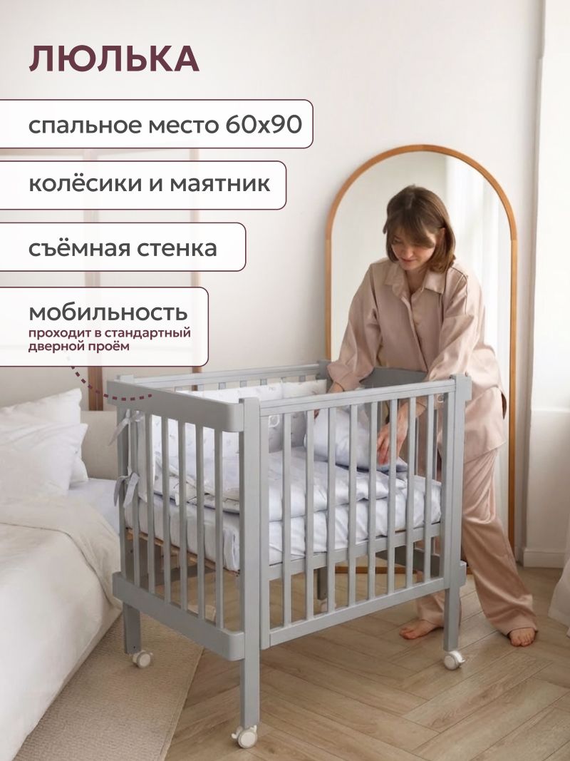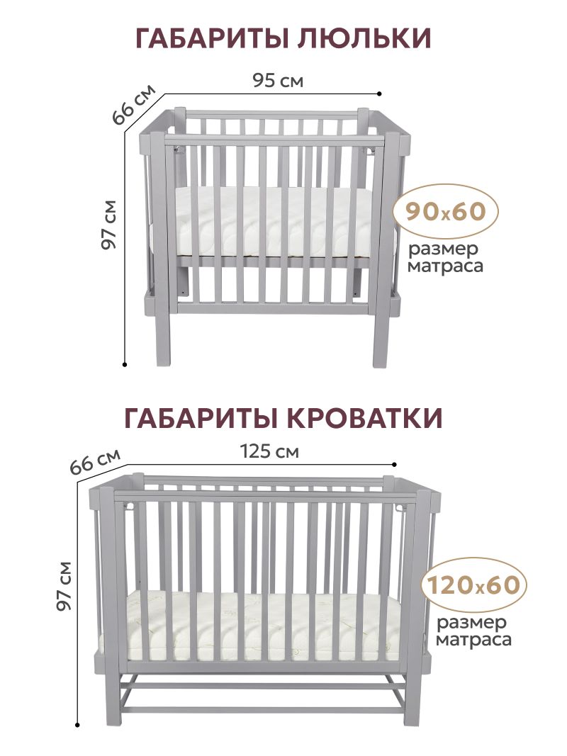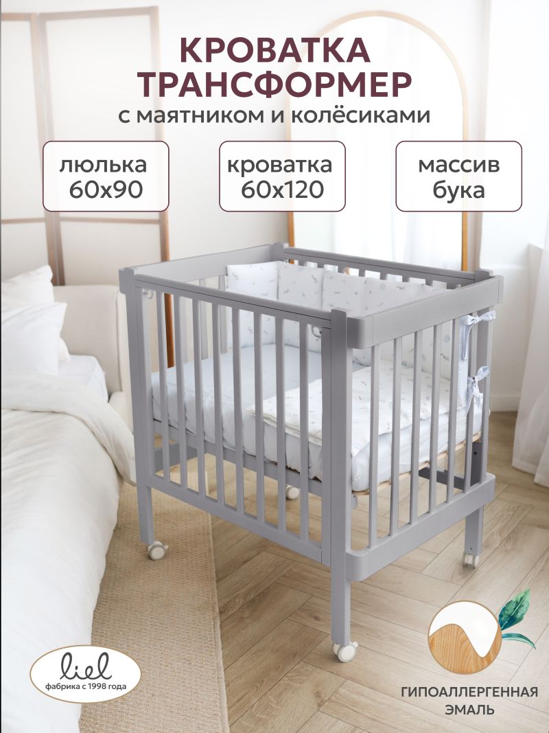 Кроватка-трансформер Liel Сириус из массива бука с гипоаллергенным эмалиевым покрытием - многофункциональная модель 3в1 ( люлька 90х60 см, кровать 120х60 см и приставная кроватка для совместного сна) с трёхуровневым ложем ( высота от пола 31, 44, 50 см),опускающейся стенкой с фиксатором ( положения 83, 90,96 см), маятниковым механизмом продольного качания, съёмной боковой панелью с ремнями фиксации, U-образными защитными накладками ( 2 шт) и колёсами, при ширине 66 см для свободного прохода в стандартный дверной проём.