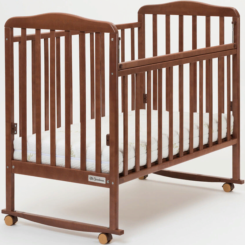 Уютная и красивая детская кроватка Mr Sandman Skylark-1 выполнена из натурального массива березы, имеет колесики и полозья для качания. Благодаря опускающейся переднее планке и двухуровневому дну уложить или достать из кроватки новорожденного будет удобно. Кроватка может использоваться как на колесиках, так и полозьях для укачивания.