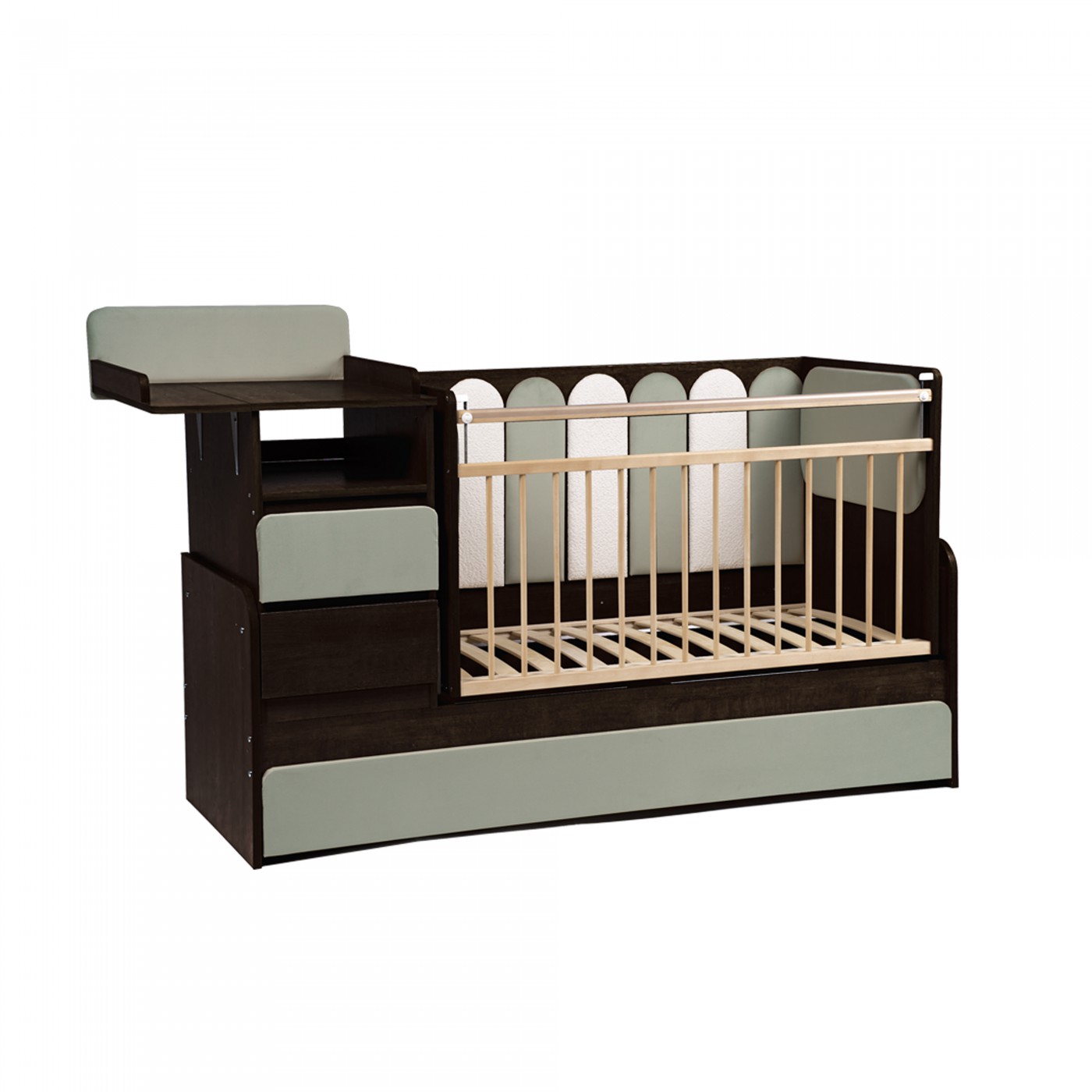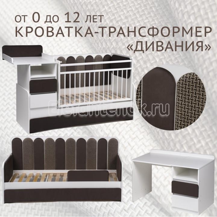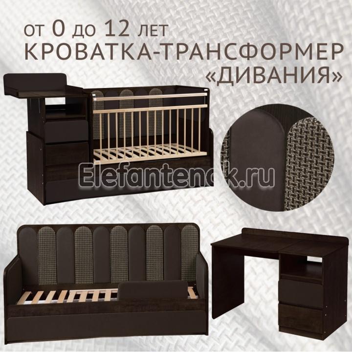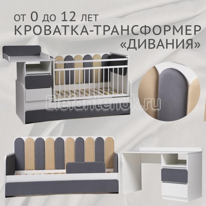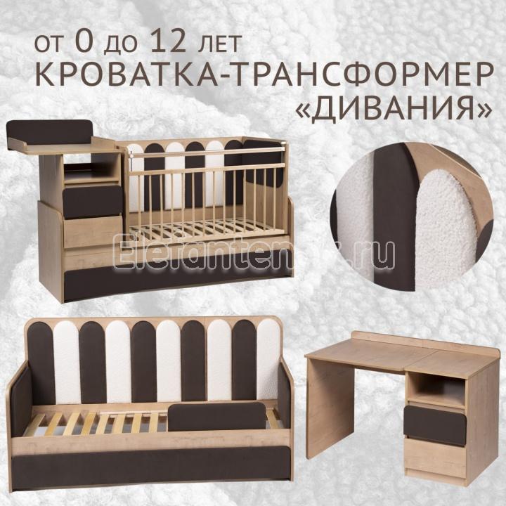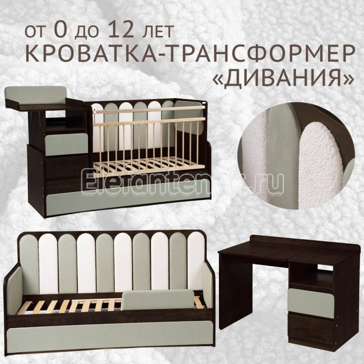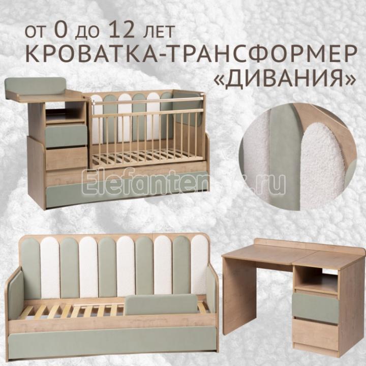 Детская кровать-трансформер Островок уюта Дивания подарит заботу малышу до 3 лет и комфорт для ребенка-подростка до 15 лет. Прекрасным дополнением кроватки являются мягкие вставки велюра, букле или рогожки, они износостойки и тактильно-приятны. Тумбочка может быть установлена с любой стороны, организует систему хранения для детских принадлежностей, нижний ящик подходит для белья и детский вещей. После трансформации Вы получите кроватку 170*60 см и отдельную тумбочку.
