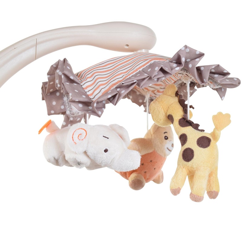 - Съемная электронная карусель с подвесными игрушками и мерцающими огоньками, которые будут развлекать малыша, пока мама занята делами по дому;
