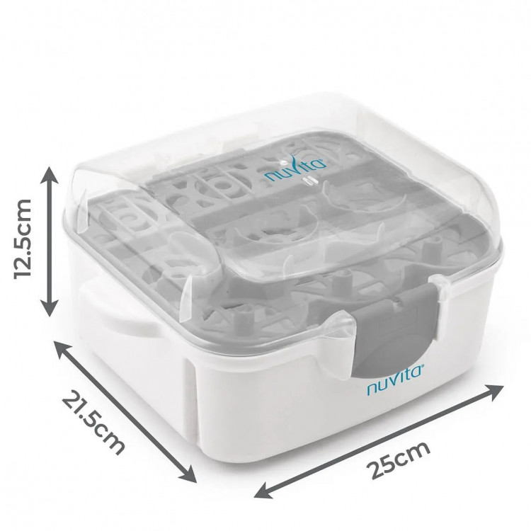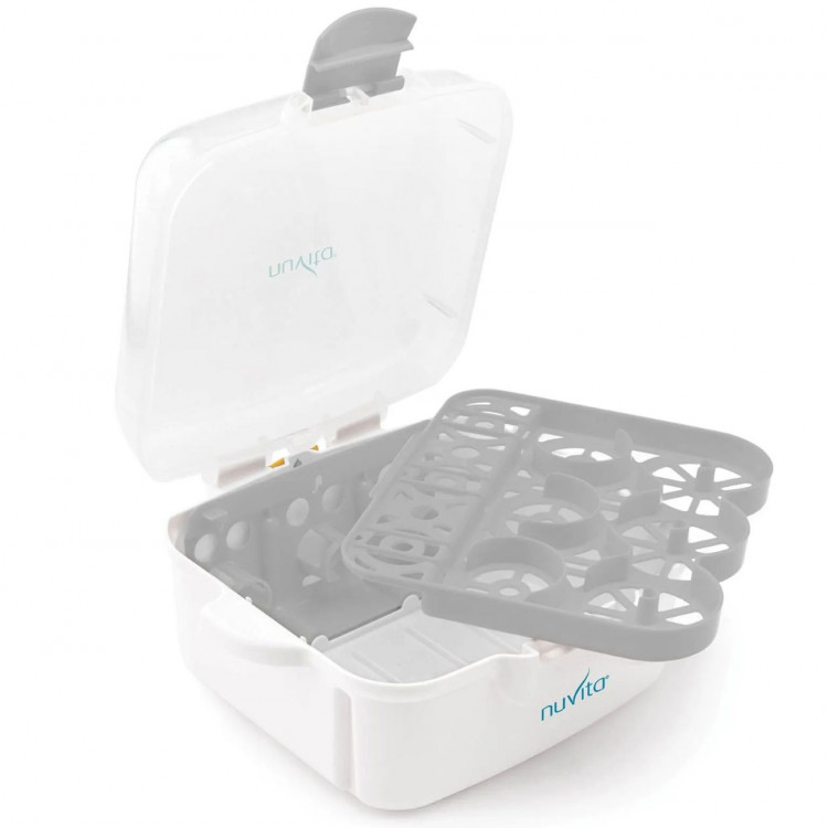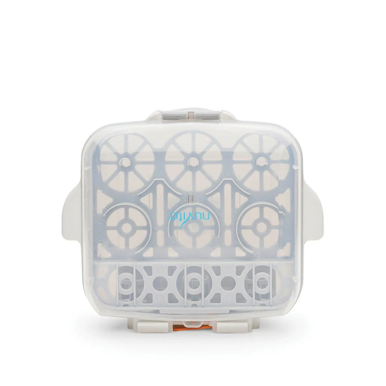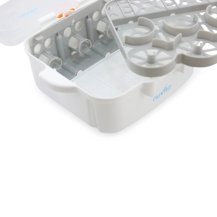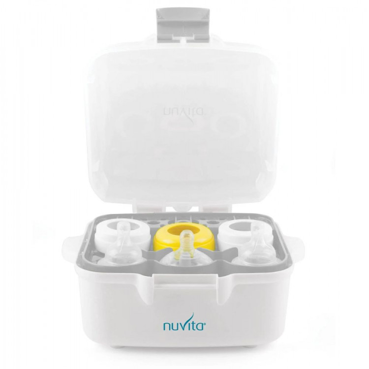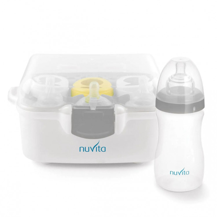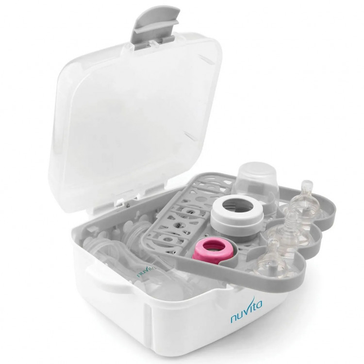 Легкий компактный современный стерилизатор для СВЧ печи Nuvita 1085 всего за несколько минут стерилизуется детские бутылочки и другие предметы, уничтожая до 99,9% микробов. Благодаря надежно закрывающейся крышке предметы после стерилизации остаются стерильными до 24 часов. Вмещает три бутылочки с широким горлышком по 250 мл и сопутствующие аксессуары.