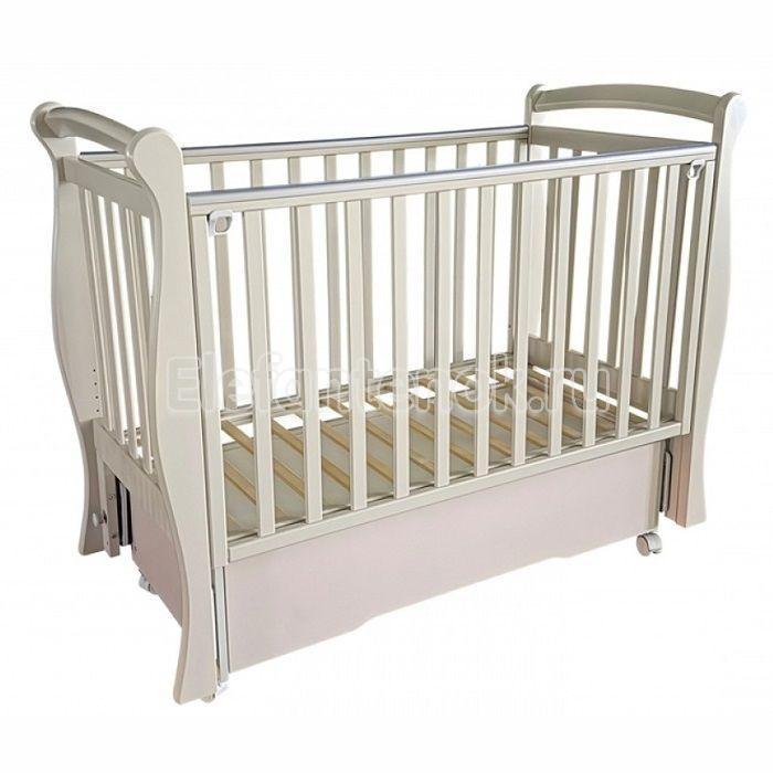 Очень красивая детская кроватка Антел Julia-1 отличается наличием изящно изогнутой боковой стенки и дополнительных планок по бокам. Закрытый ящик решит вопрос с хранением постельного белья, игрушек и прочих вещей. При сборке вы можете выбрать способ качания маятника: в продольном или поперечном направлениях. Подросший ребенок самостоятельно сможет залезать и вылезать из кроватки: для этого необходимо вынуть три центральные рейки. Приятным дополнением является наличие на боковинах силиконовых накладок.