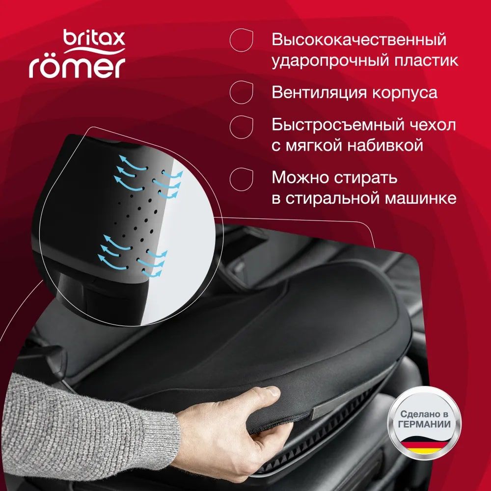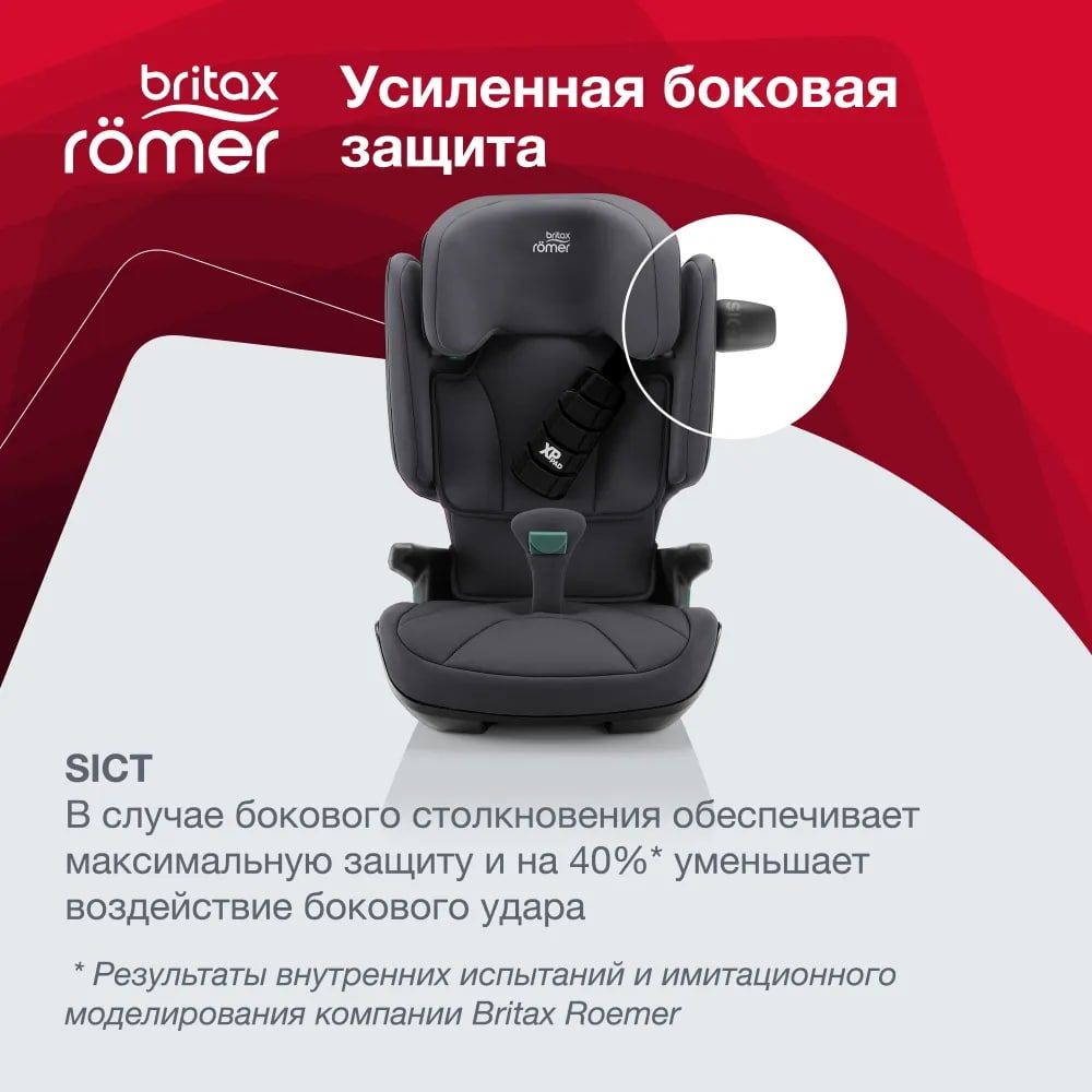 Автокресло Britax Romer KidFix i-Size подходит для детей ростом 100-150 см и сочетает продуманную эргономику с многоуровневой системой безопасности: V-образная спинка обеспечивает пространство в плечевой зоне по мере роста ребёнка, а подголовник с регулировкой по высоте поддерживает голову и шею в анатомически правильном положении; защита реализована через усиленные боковины ( от головы до бёдер), направляющие для корректного положения ремня, технологию Sict ( защита при боковом ударе), энергопоглощающую накладку XP-Pad и фиксатор ремня SecureCuard в четвертой точке; дополнительно предусмотрены вентиляционные отверстия для комфортного микроклимата, амортизирующая накладка для защиты шеи и груди при лобовом столкновении, облегчённая конструкция ( на 0,6 легче предшествующей модели - это позволяет разместить 3 кресла в ряд), возможность установки с помощью Isofix или штатного ремня, а также съёмный чехол для удобства ухода.