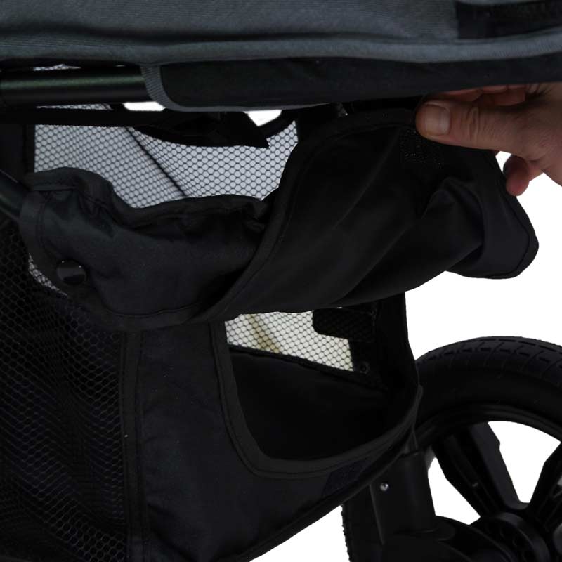 - Задняя стенка коляски полностью открывается для проветривания, а встроенная в нее москитная сетка способствует свободной циркуляции воздуха.