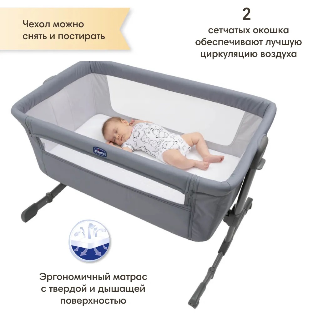 Кроватка Chicco Next2me Essential - приставная колыбелька от Chicco создана, чтобы сделать первые месяцы жизни малыша и отдых родителей комфортнее. Модель легко крепится к взрослой кровати с помощью надёжной системы фиксации - это упрощает ночное кормление и помогает малышу быть спокойным, ощущая маму рядом.