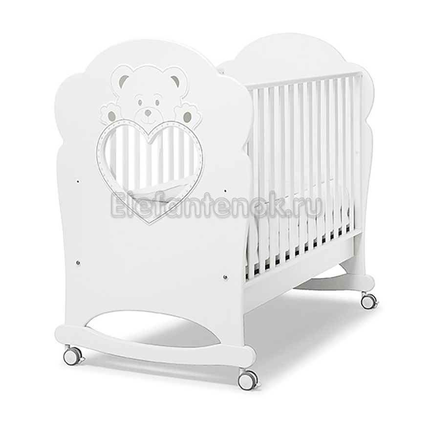 Erbesi Cucciolo проста, элегантна и изящна. Кроватка изготовлена из массива бука, обработана безопасными лаками и красками и украшена декором в виде медвежат и кристаллами Swarowsky. При необходимости колеса снимаются и кроватка становится качалкой. Ложе кроватки может устанавливаться в 2 уровнях по высоте. Для лучшей вентиляции дно изготовлено из деревянных рееек. Одна из боковин снимается и кроватка превращается в уютный диванчик. Вместительный ящик всегда пригодится для постельных принадлежностей, а 4 поворотных колеса с блокирующим тормозом делают кроватку не только маневренной, но и безопасной. Симпатичная кроватка