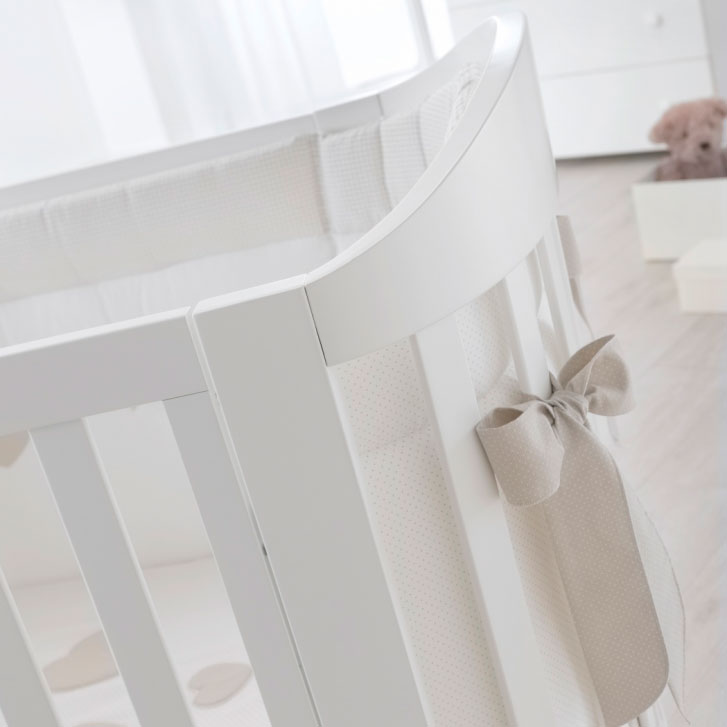 Erbesi Mirtillo Ovale - итальянская кроватка овальной формы с матрасом в комплекте. Передняя стенка украшена объемной аппликацией очаровательного мишки.