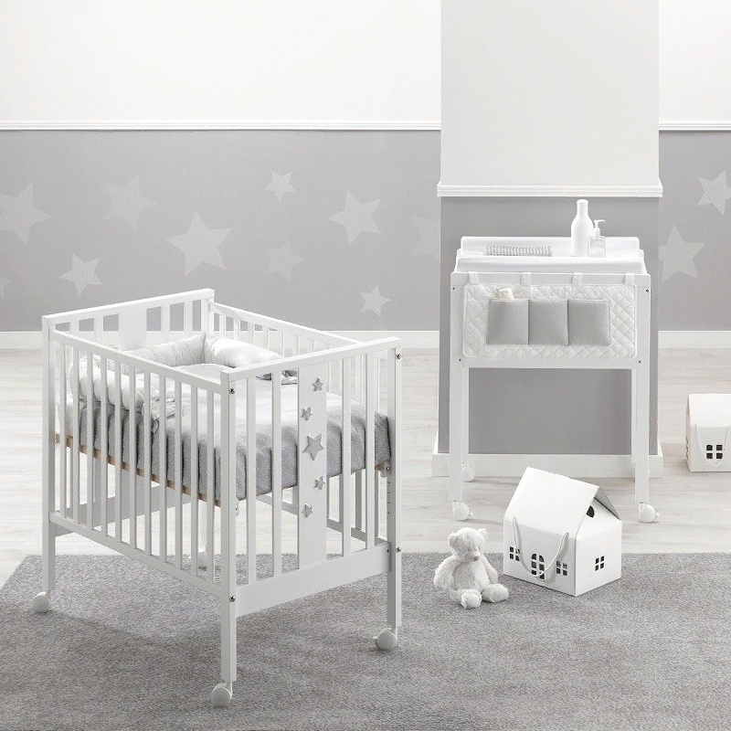 Небольшая деревянная детская кроватка Erbesi Stellina Mini может использоваться в качестве приставной, имеет 9 уровней высоты подматрасника и колесики со стопорами. Кроватка выполнена в общем стиле комнаты и декорированная аппликациями в виде звездочек. Кроватка станет для новорожденного уютным гнездышком для сна. Благодаря колесикам кроватку легко передвигать.