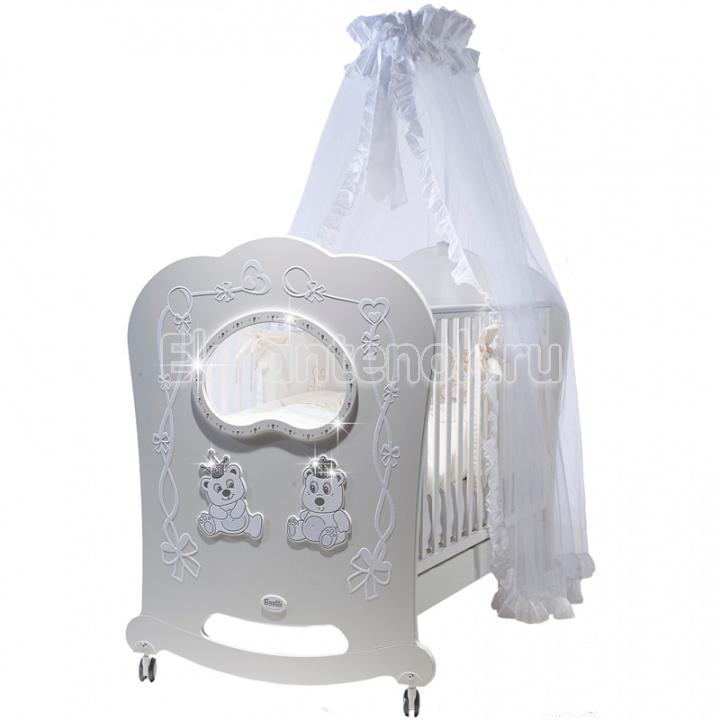 Поистине сказочная кроватка-качалка Feretti Majesty Oblo Brillante восхищает своим уникальным дизайном, декорирована очаровательной аппликацией и украшенная россыпью сверкающих страз Swarovski. Кроватка благодаря полозьям может использоваться как качалка. Подкроватный ящик решит вопрос с хранением постельного белья, игрушек и прочих вещей. Безопасное окошко из оргстекла позволит вам наблюдать за малышом.