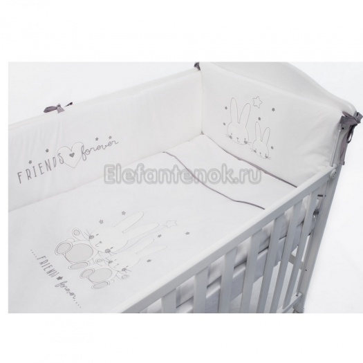 В комплекте Funnababy Friends из 5 предметов есть все, что нужно Вашему малышу для крепкого и здорового сна. Завязочки на бортиках не позволят малышу снять их с кроватки. Комплект Funnababy Friends из 5 предметов – это нежность и забота, воплощённые в пастельных тонах, орнаментальной вышивке и мягком хлопке. Белье можно стирать при 30°С. Чехлы с бортика не снимаются и также подлежат стирке.