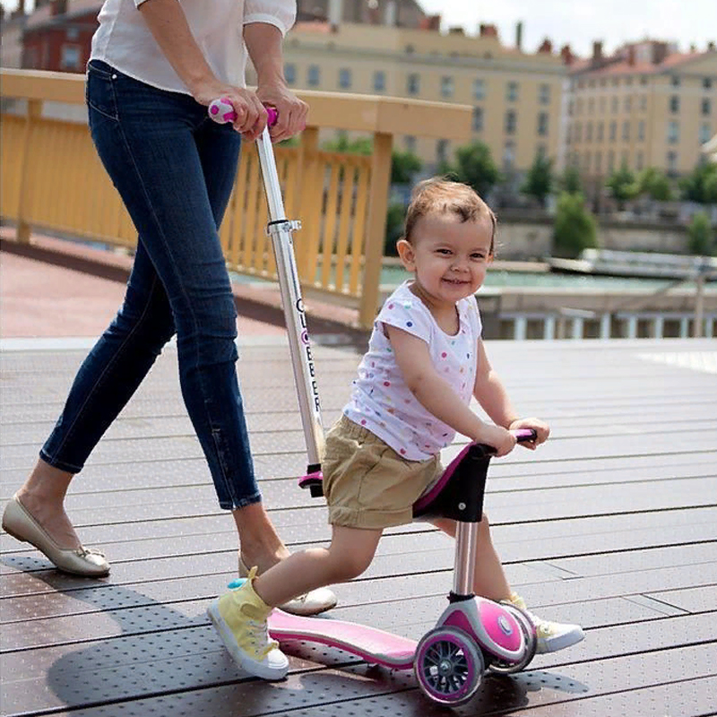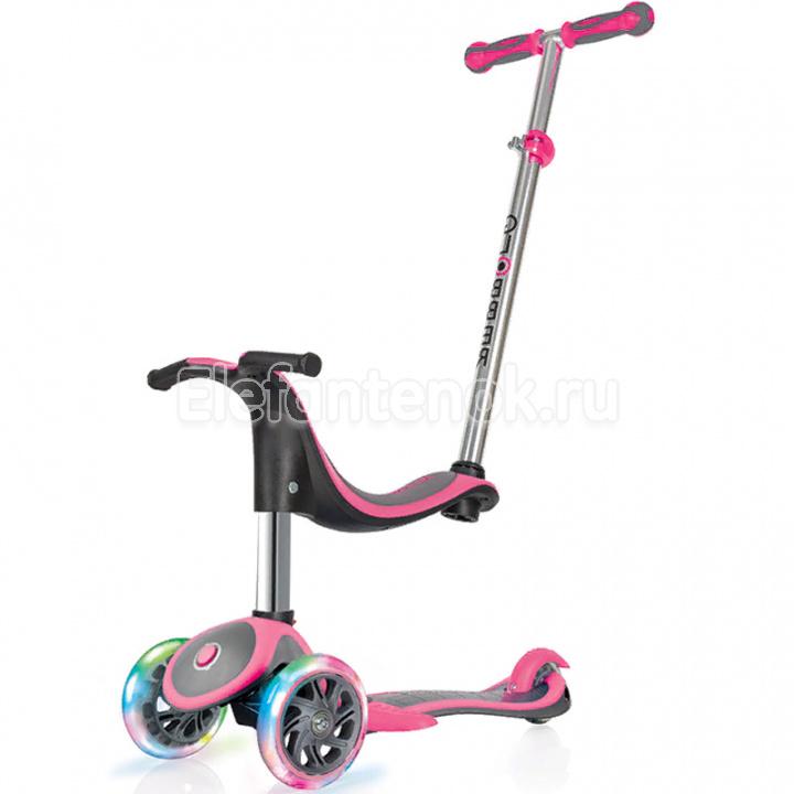 GLOBBER EVO 4 in 1 PLUS - инновационный самокат-каталка революционного дизайна на светящихся evo-колесах и удобными подножками. Световое шоу в ночное время суток смотрится потрясающе. В зависимости от возраста ребенка используйте трансформацию в виде каталки с родительской ручкой или без нее или трехколесного самоката. Данная модель поможет ребенку развить координацию движений, укрепить мышцы и просто получить массу удовольствия от катания.