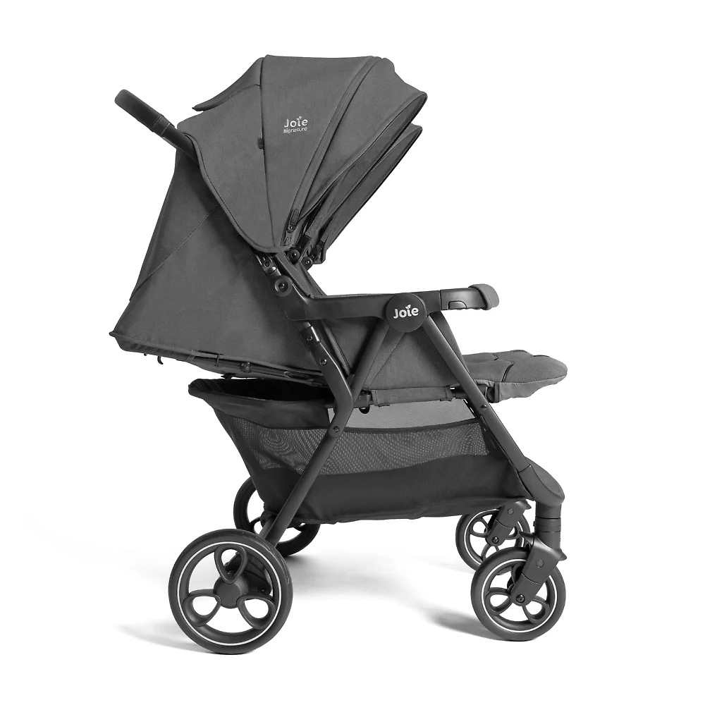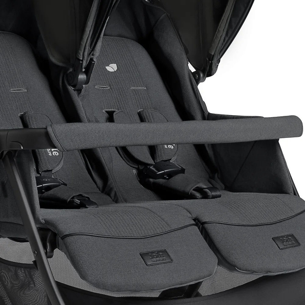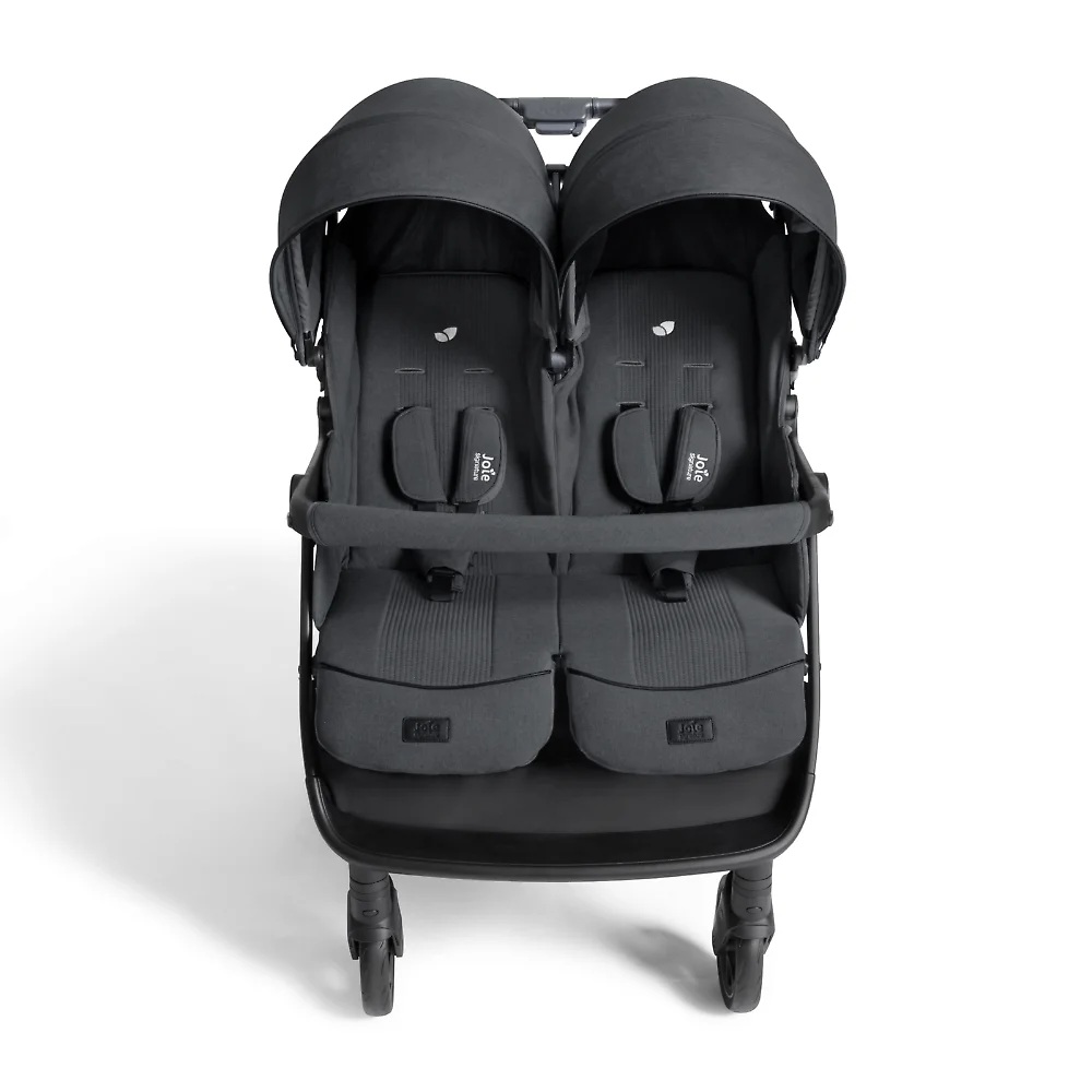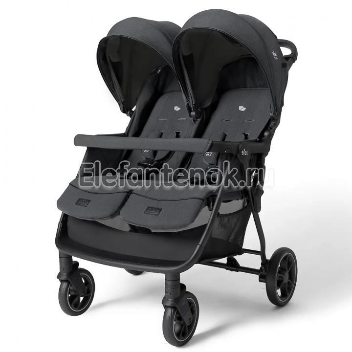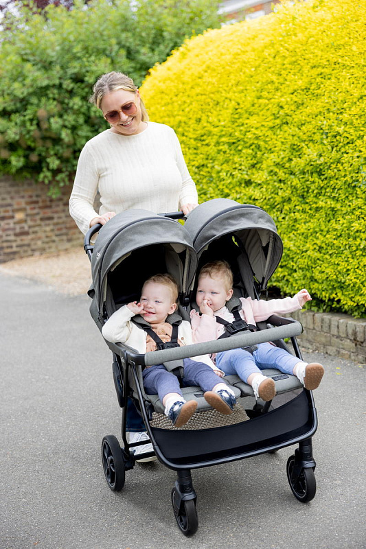 Joie Estella - прогулочная коляска для двойни или погодок с независимыми сиденьями ( регулируемыми по наклону спинки и длине подножки), защитным капюшоном с вентиляцией и смотровыми окошками, рамой из авиационного алюминия, амортизированными прорезиненными колёсами и возможностью компактного складывания одной рукой.