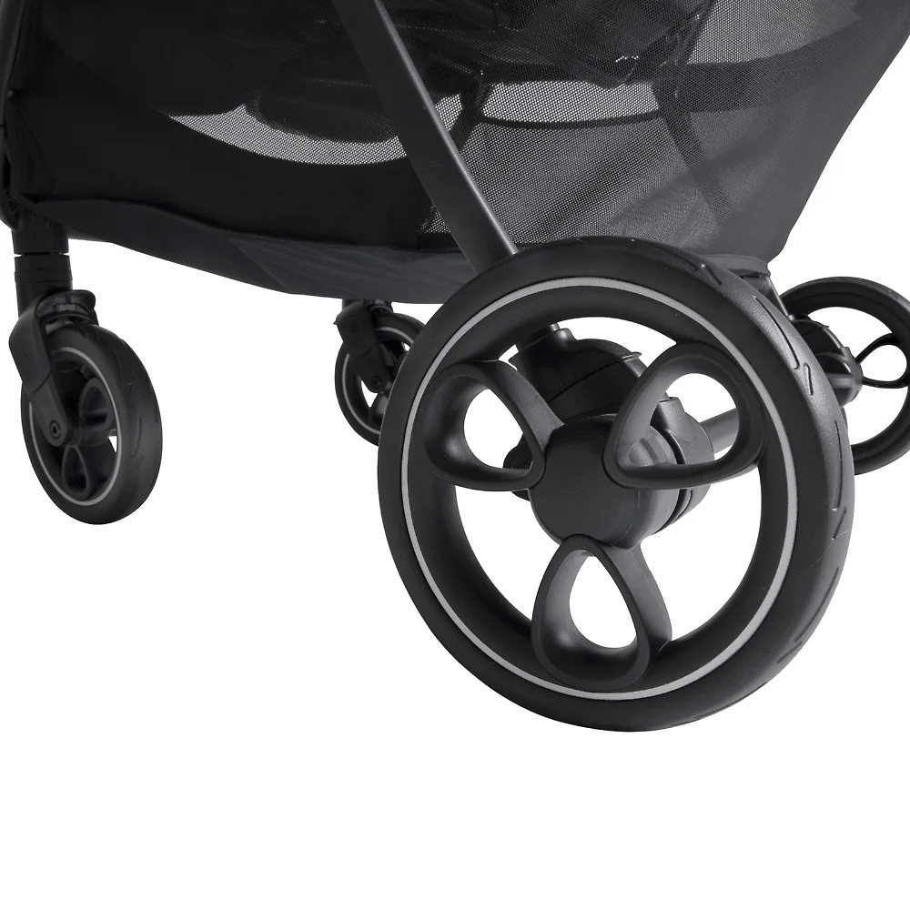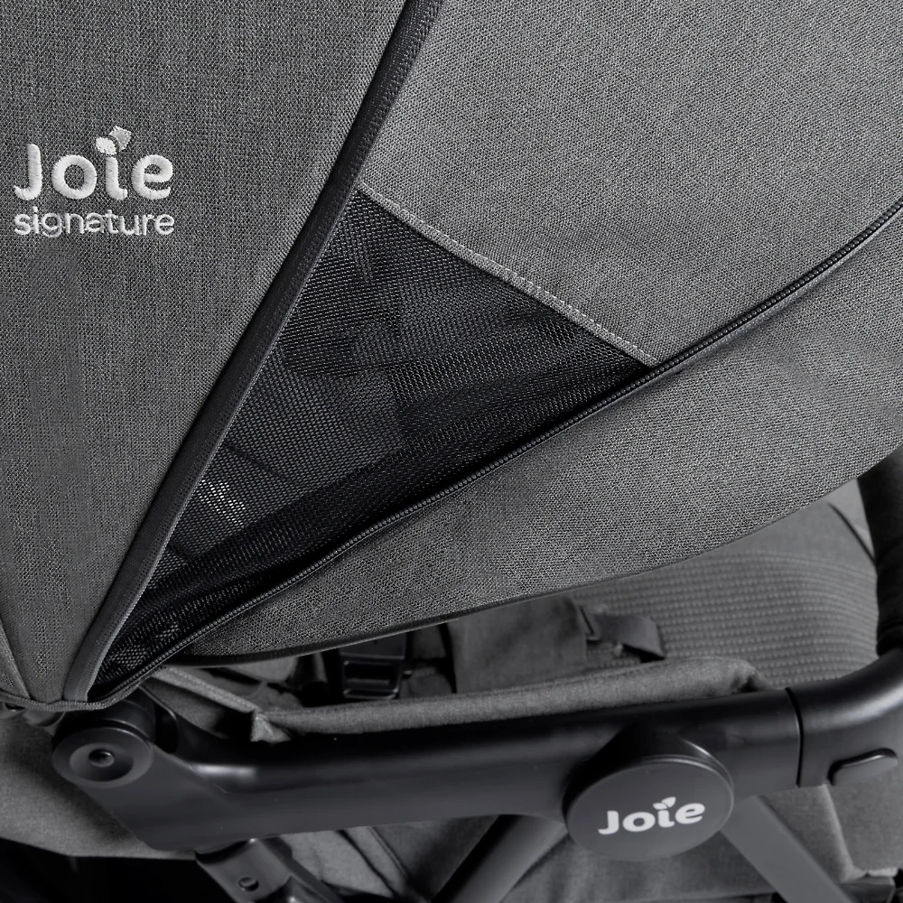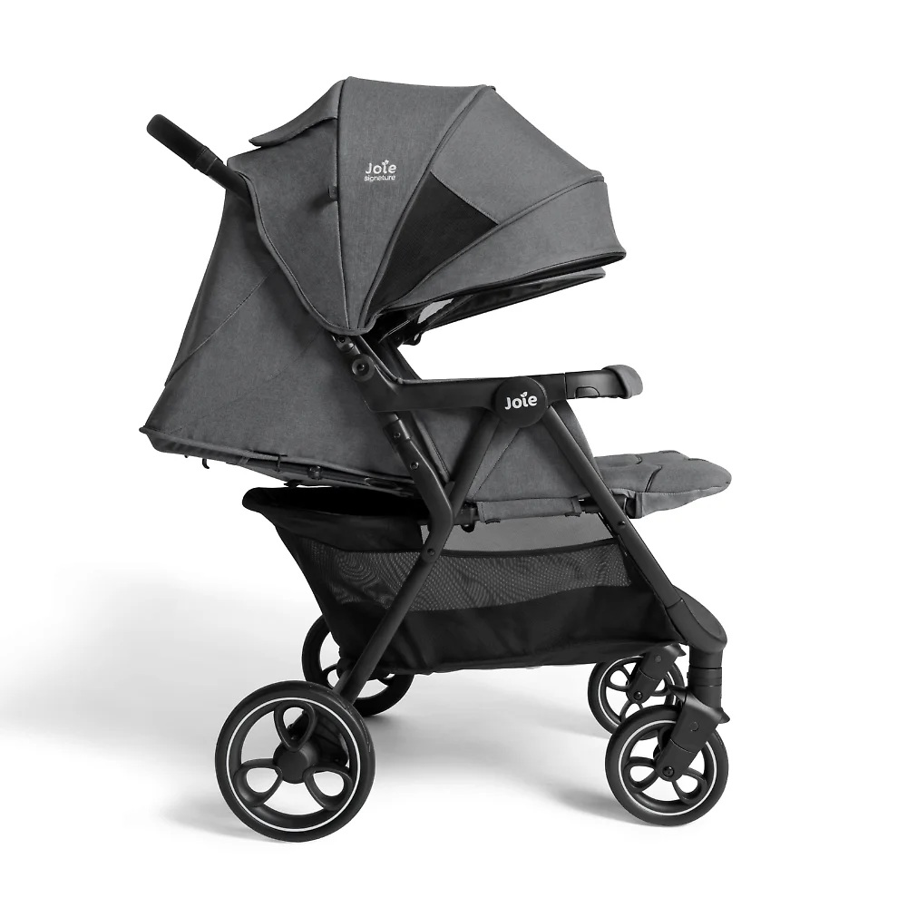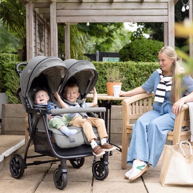 Joie Estella - прогулочная коляска для двойни или погодок с независимыми сиденьями ( регулируемыми по наклону спинки и длине подножки), защитным капюшоном с вентиляцией и смотровыми окошками, рамой из авиационного алюминия, амортизированными прорезиненными колёсами и возможностью компактного складывания одной рукой.