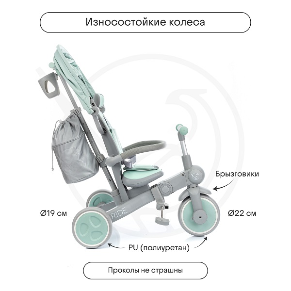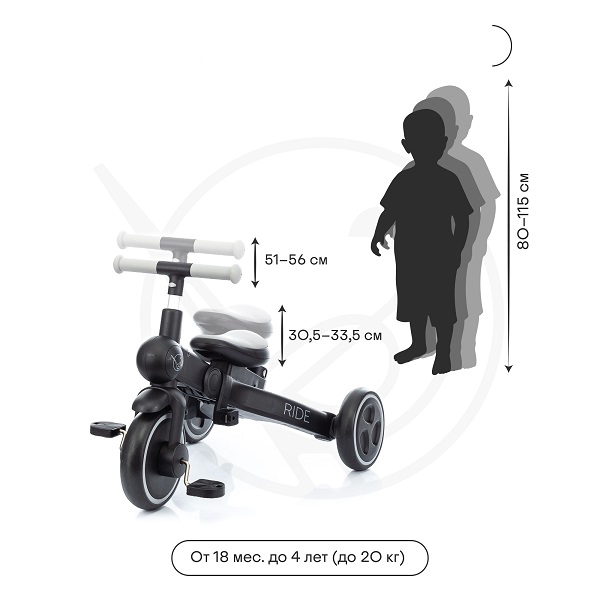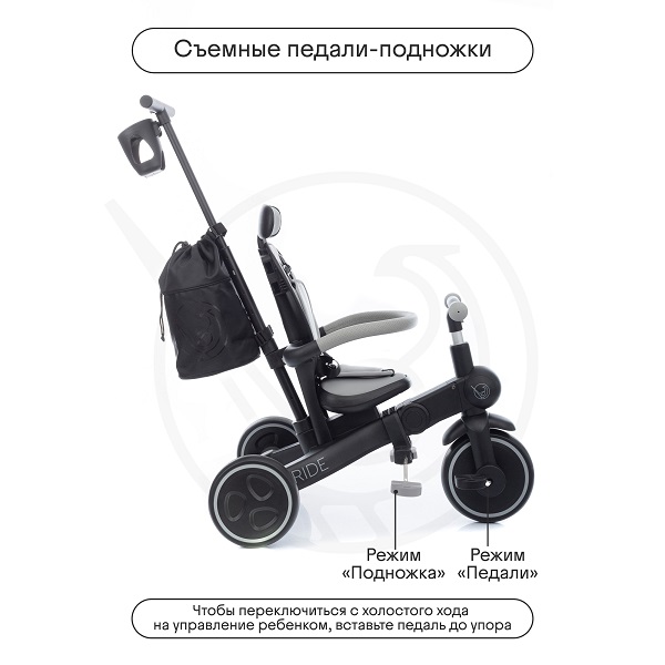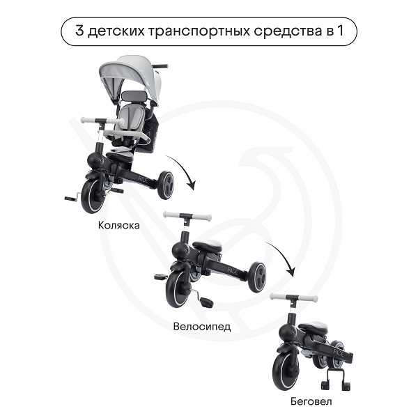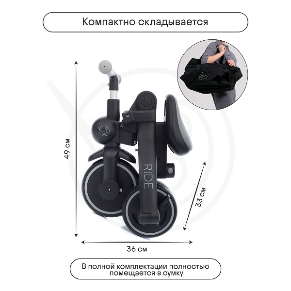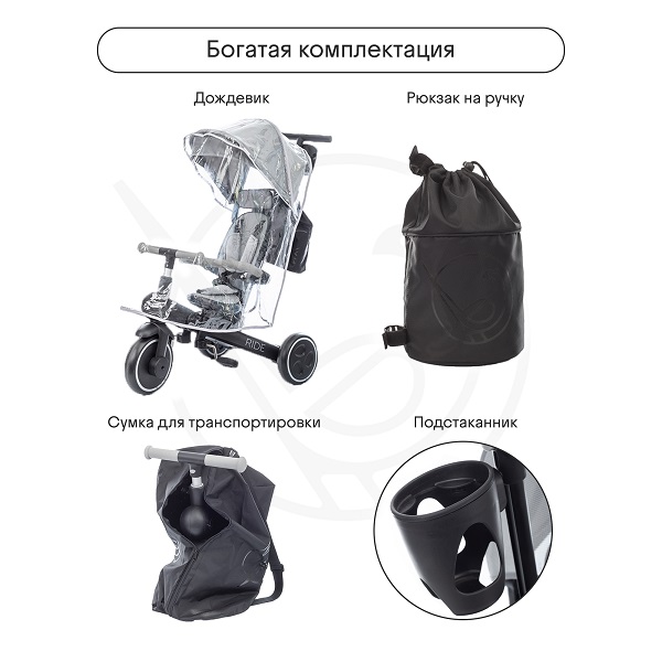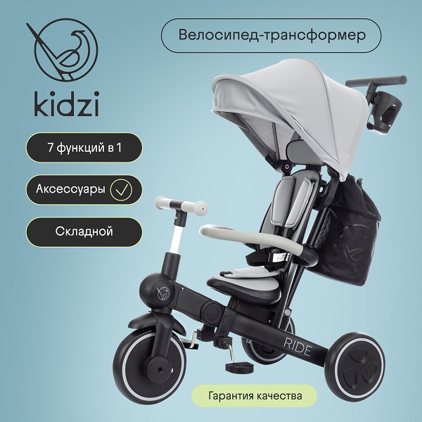 Kidzi Ride - легкий складной трехколесный велосипед растет вместе с ребенком: высота сиденья быстро настраивается, а сама модель трансформируется в компактный беговел - так малыш переходит на новый этап освоения транспорта. По другим характеристикам обладает те ме же преимуществами, что и альтернативные модели: родительская ручка регулируется, руль можно временно отключить, наличие 5точеченых ремней безопасности, защитный съемный бампер и капюшон. У Kidzi Ride обширная комплектация: дождевик, рюкзак на ручку, подстаканник и транспортировочная сумка.