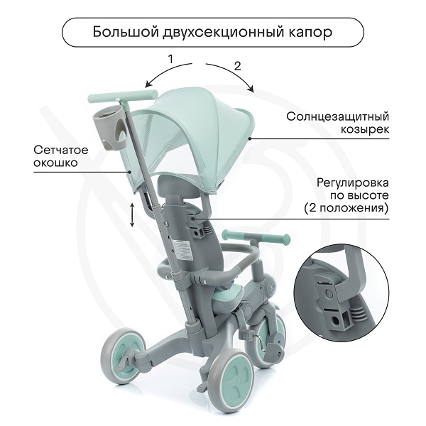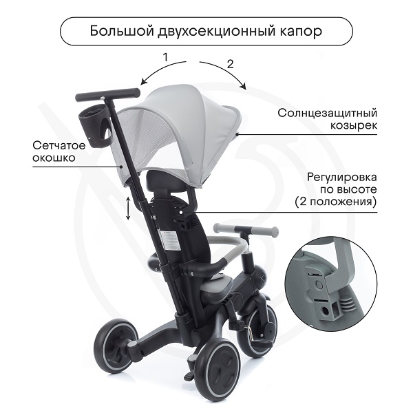- Двухсекционный защитный капюшон с сетчатым окном и дополнительный козырек от ярких солнечных лучей.