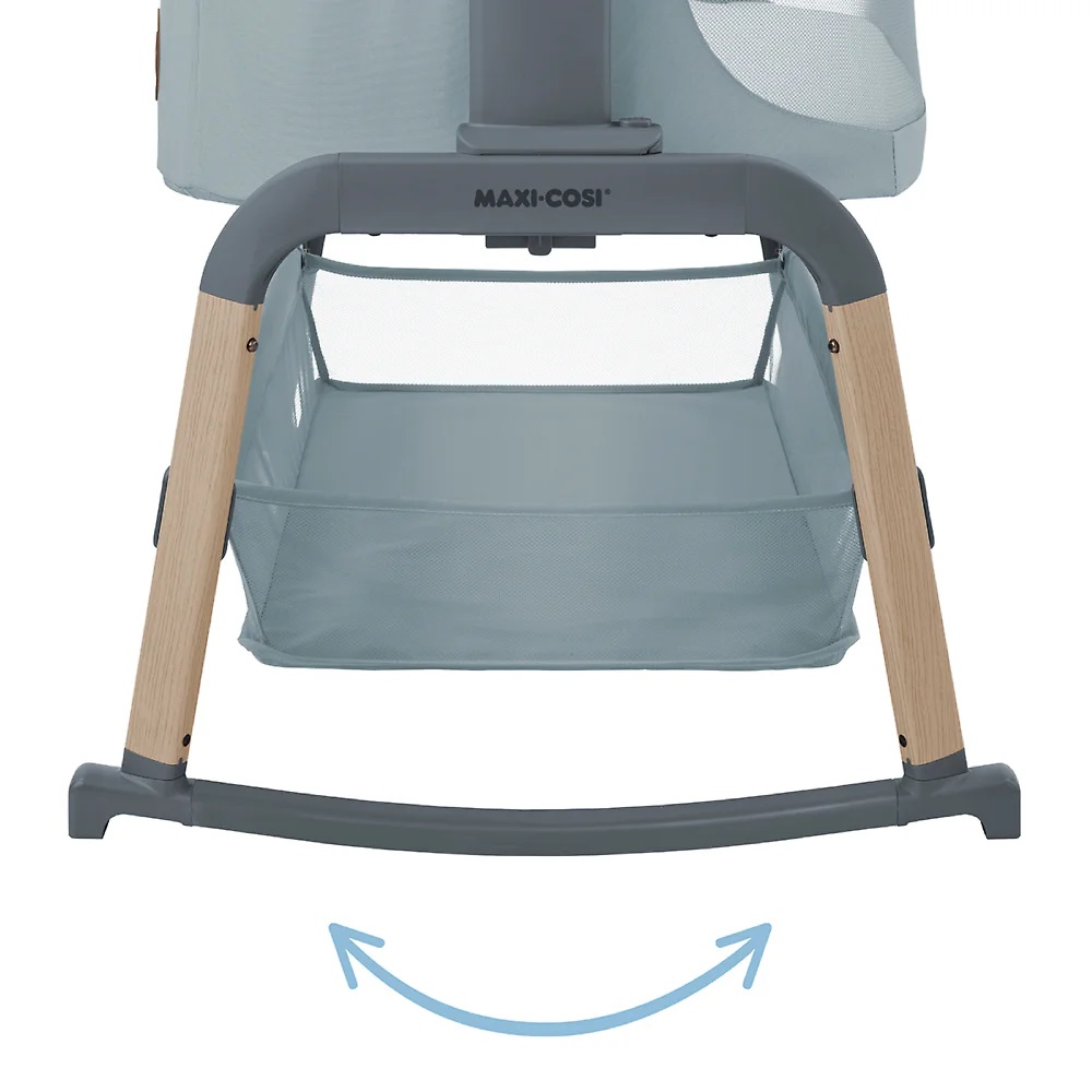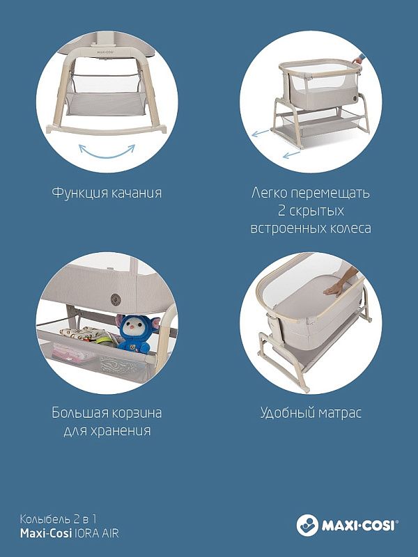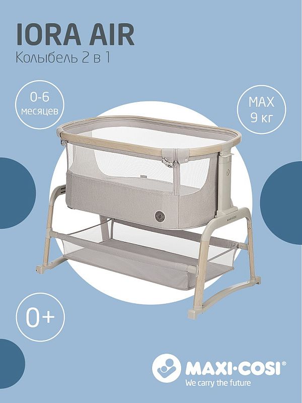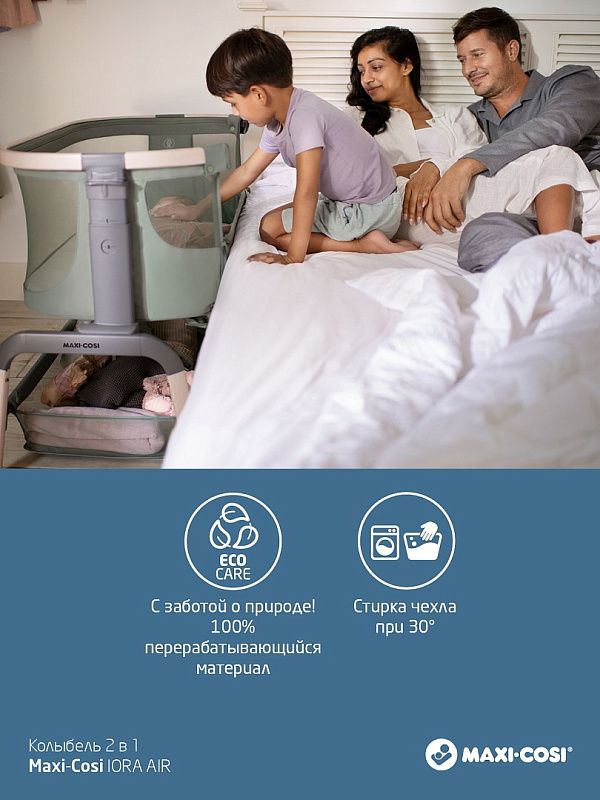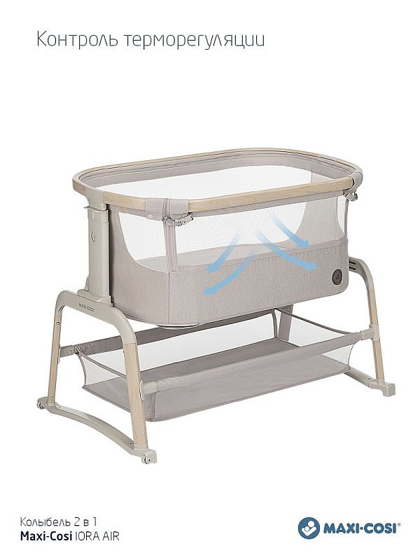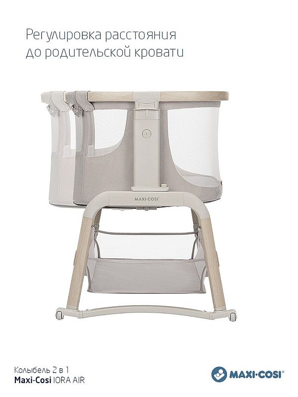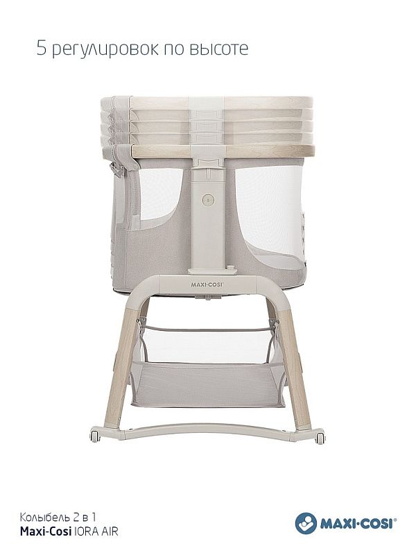 Maxi-Cosi Iora Air - многофункциональная кроватка-колыбель для новорождённых с сетчатыми бортиками для вентиляции, регулировкой высоты ( 5 положений), откидным бортиком, функцией качания, колёсами для перемещения, съёмной "дышащей" обивкой из переработанных тканей Eco Care, толстым матрасом и вместительной корзиной для вещей, которая легко складывается для транспортировки.