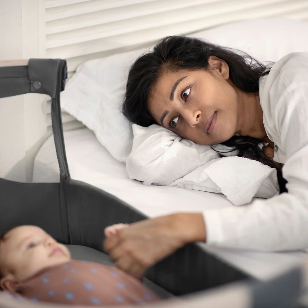 Чтобы разместить колыбель вплотную к кровати воспользуйтесь регулировкой высоты и откидным бортиком. Для безопасности обязательно закрепите изделие ремнями из комплекта - это исключит риск выпадения малыша.