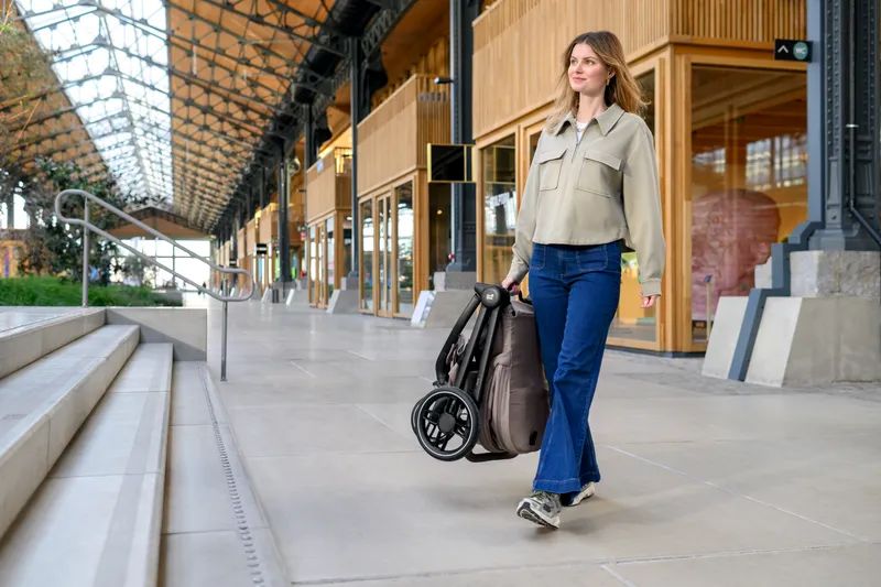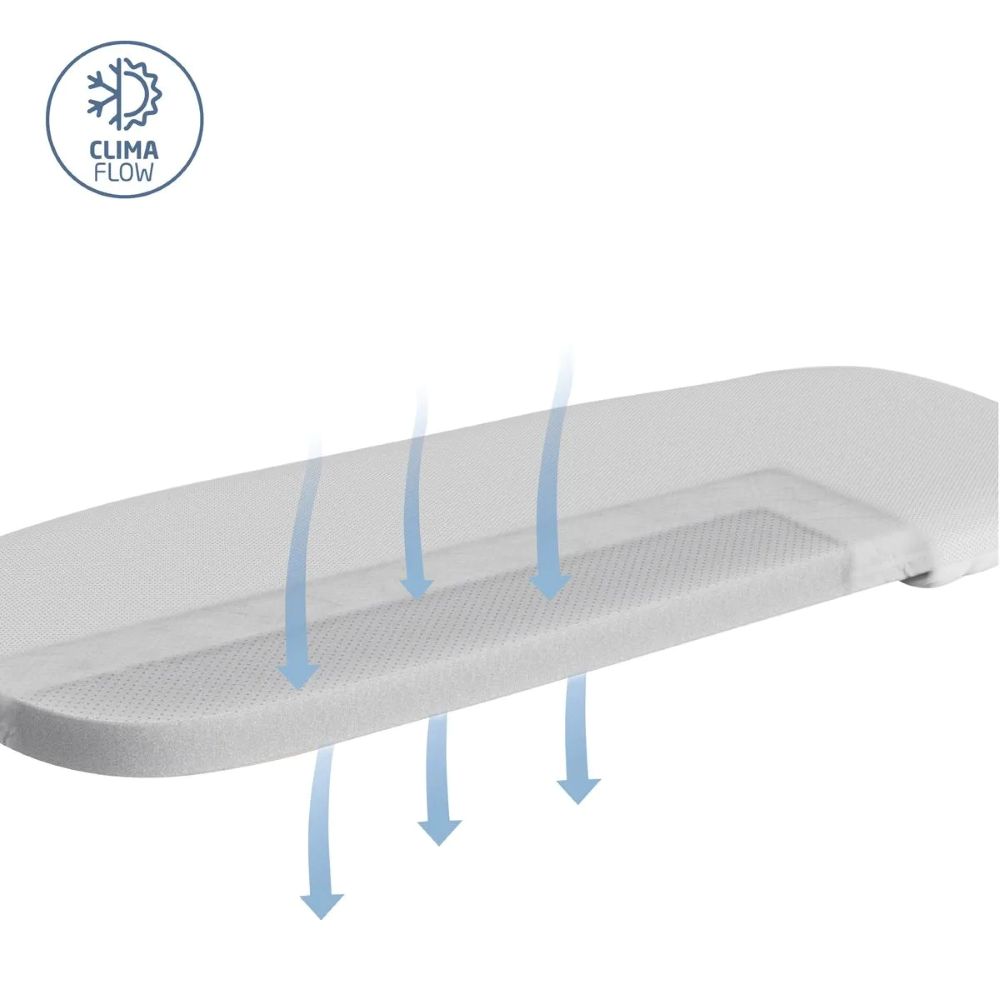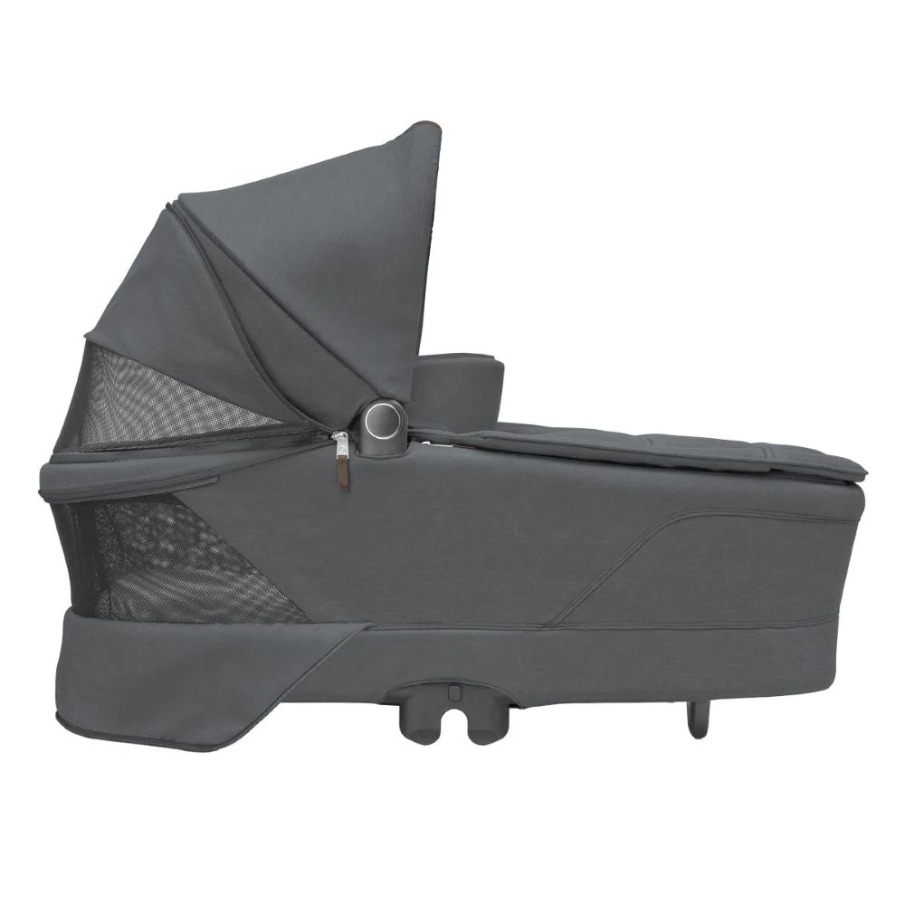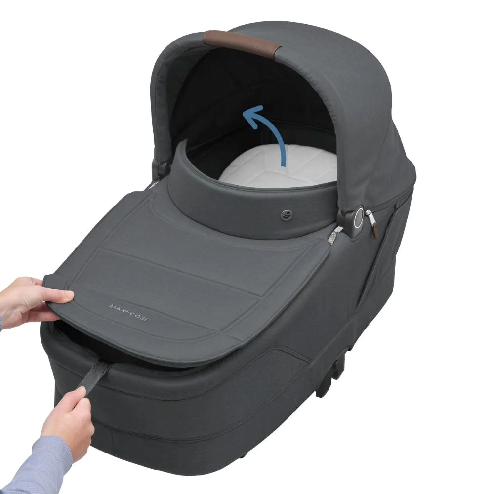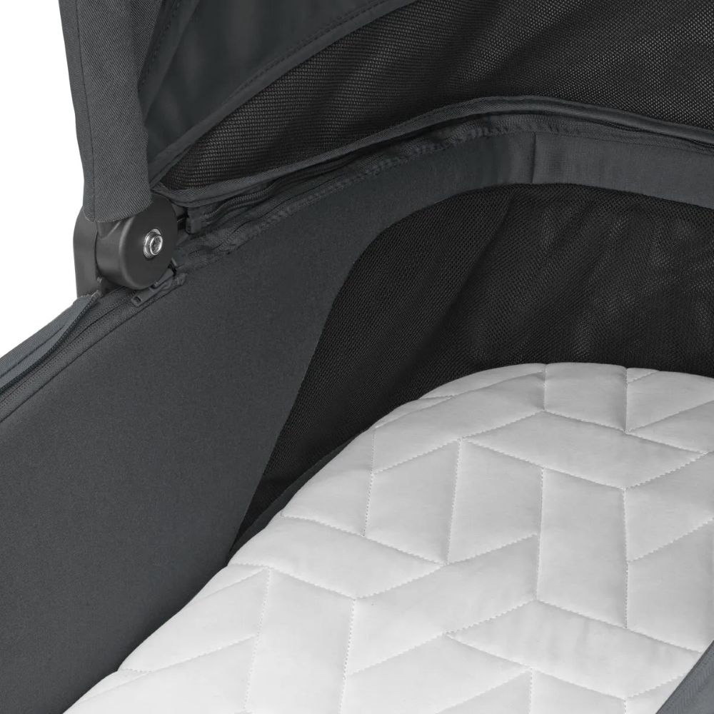 Люлька оснащена просторной конструкцией с двусторонним матрасом ( органический хлопок и воздухопроницаемая сетка), вентиляционными панелями ClimaFlow, смотровым окном, органайзером и раскладным капором с солнцезащитным козырьком; она складывается для транспортировки и имеет ручку на капюшоне.