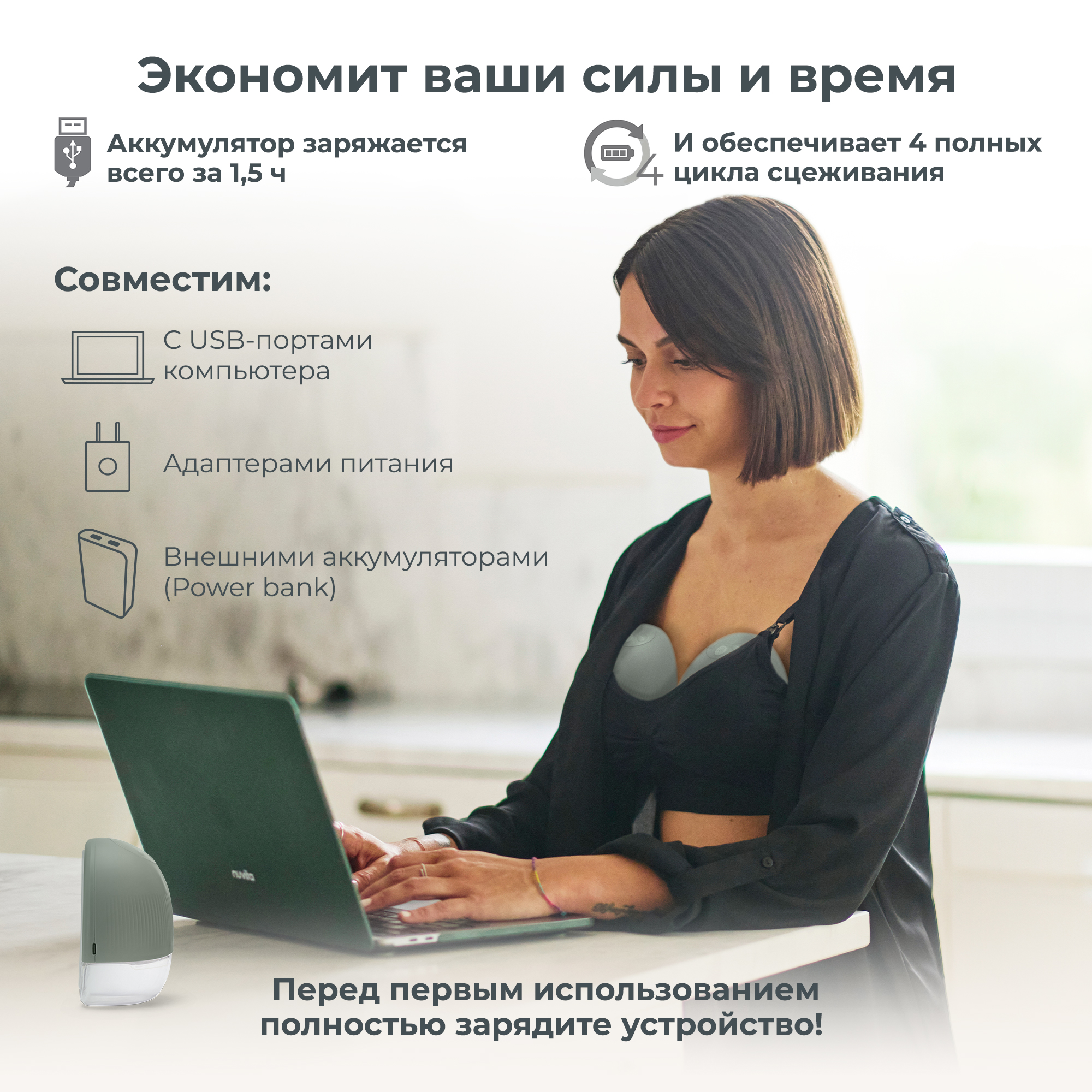 - полный заряд позволяет совершить 4 цикла сцеживания;