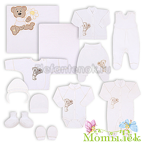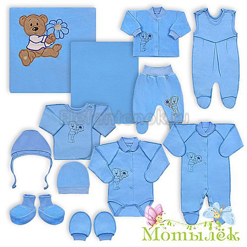 Комплект для малыша 12 предметов. Все изделия комплекта выполнены из натуральных тканей, безопасных для малыша и приятных на ощупь. Представленные расцветки позволяют преобрести комплект как для девочки, так и для мальчика.