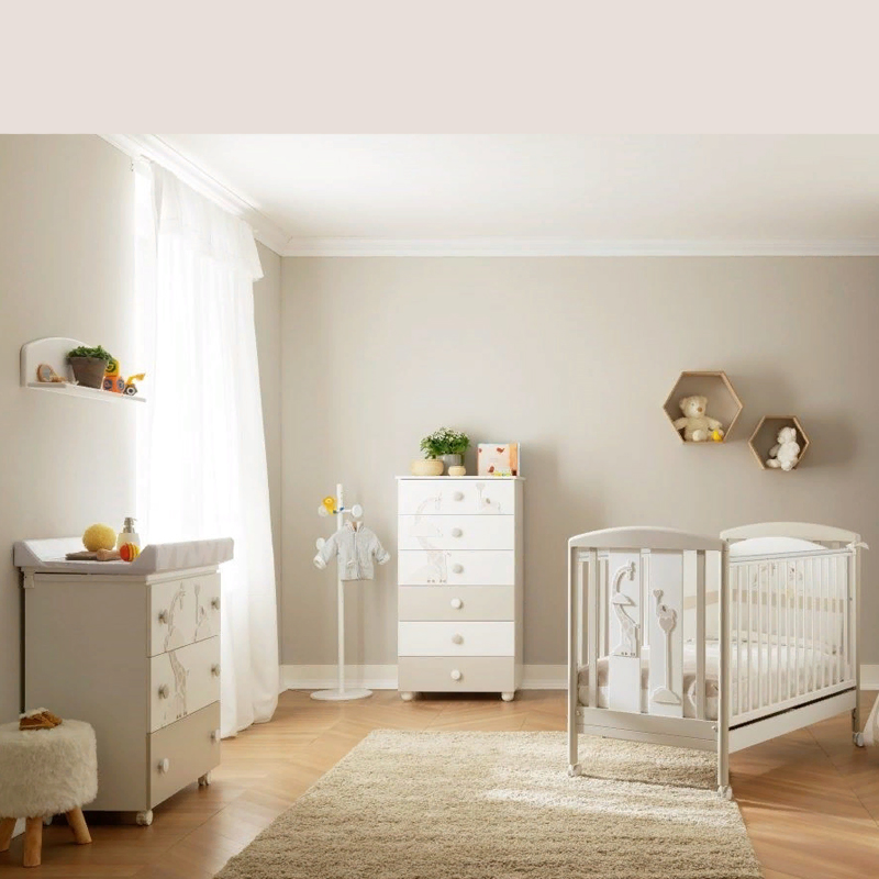 Красивый пеленальный комод с ванночкой Pali Savana декорирован слоненком и жирафом, имеет три выдвижных ящика и прорезиненные колесики. Под откидной доской имеется анатомическая ванночка. На пеленальной доске удобно переодевать малыша. В ящиках надеется местечко для необходимых под рукой вещей. За счет колесиков мебель легко передвигать.