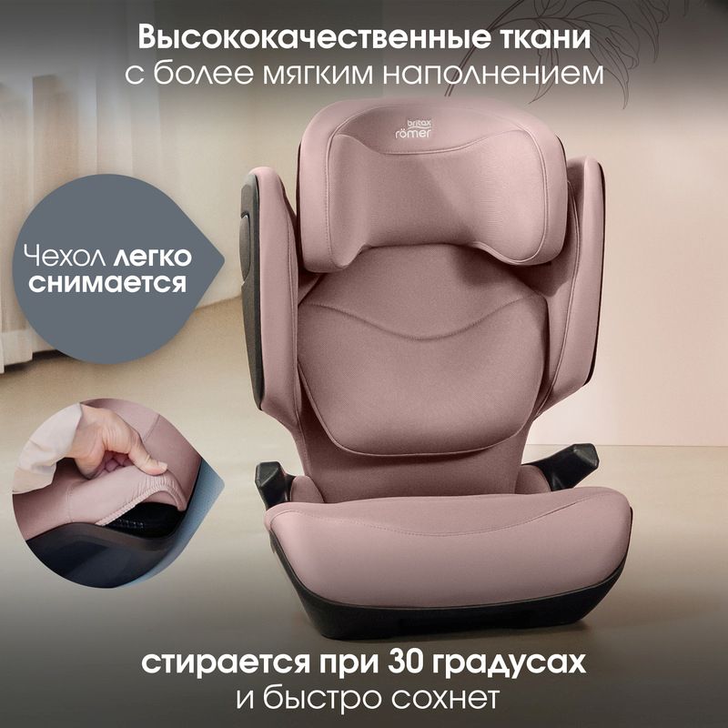 Вентиляционные отверстия и сетчатая ткань улучшают циркуляцию воздуха в жару, съёмный чехол можно постирать в машинке, а высокая спинка с направляющими ремня обеспечивает поддержку от головы до бёдер во время поездки.