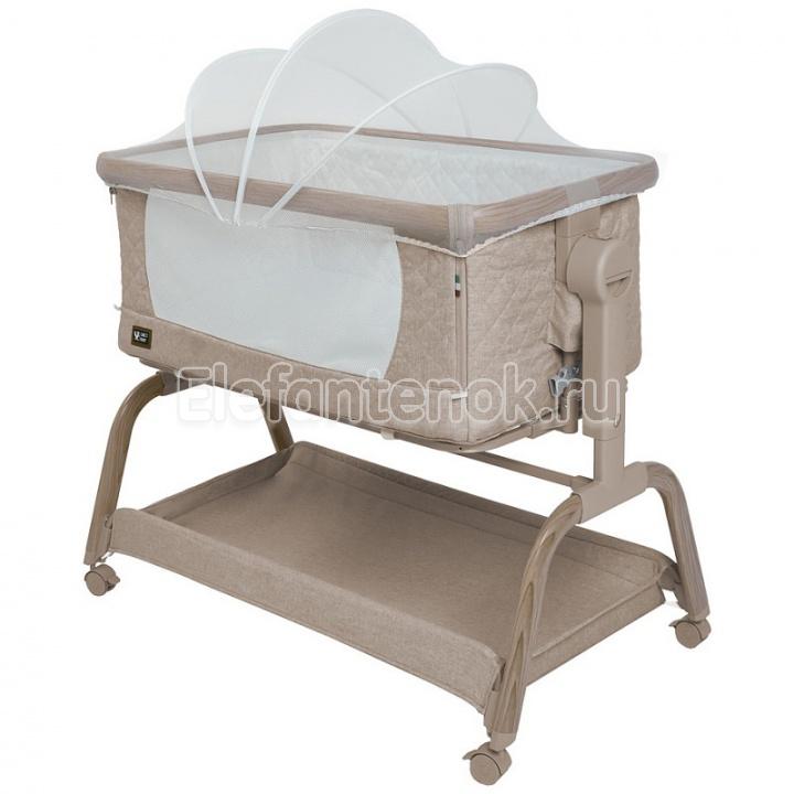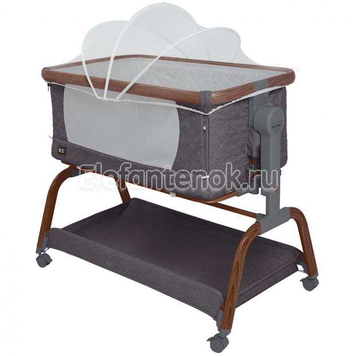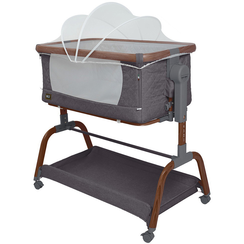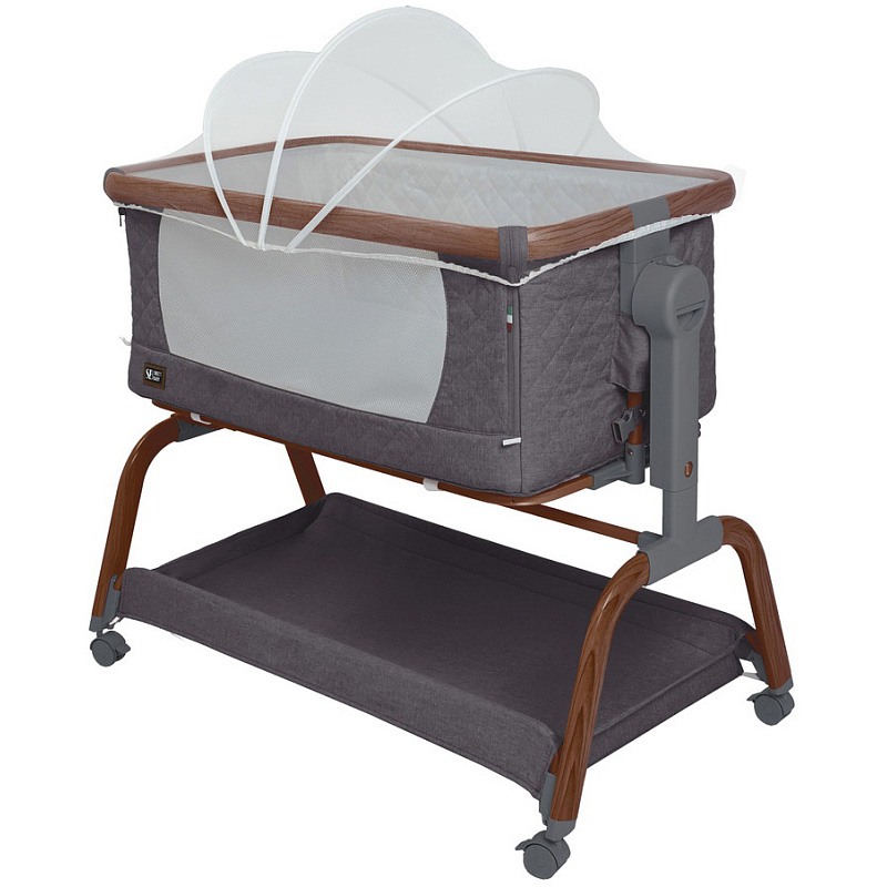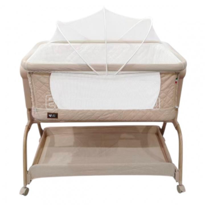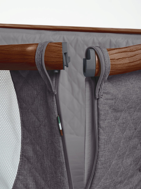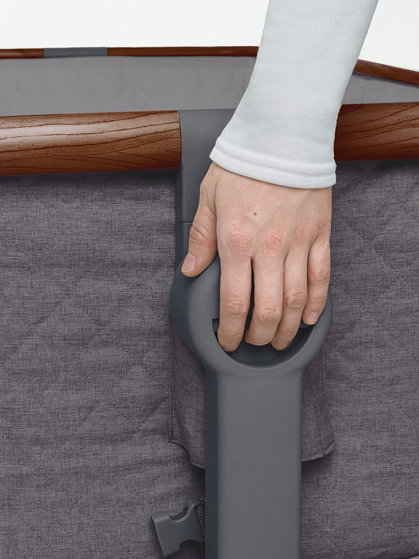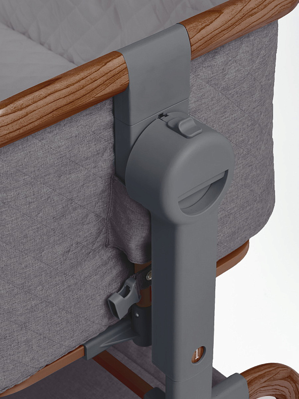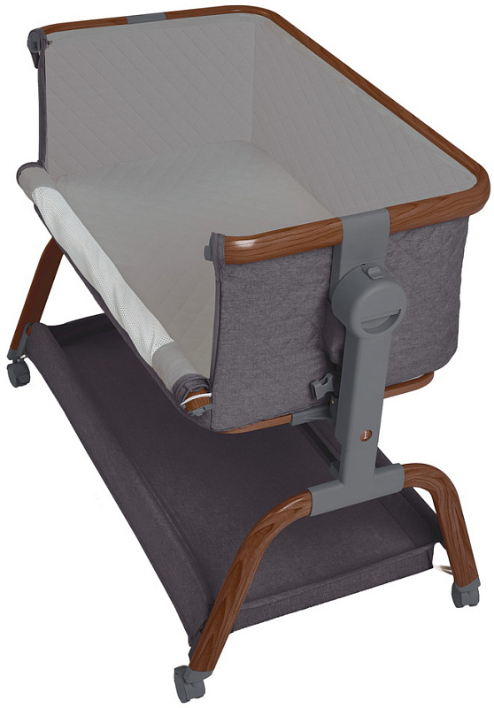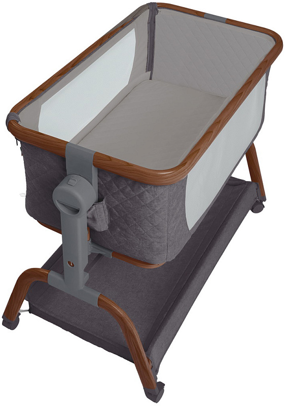 Трансформируемая конструкция с надёжными фиксаторами и крепёжными ремнями превращает её в приставную кроватку, а открывающаяся передняя стенка и съёмный мягкий бортик на молнии упрощают доступ к ребёнку и уход за изделием ( бортик можно снять и постирать). В комплект входит анатомический матрасик ( 3 см) со съёмным чехлом на молнии.