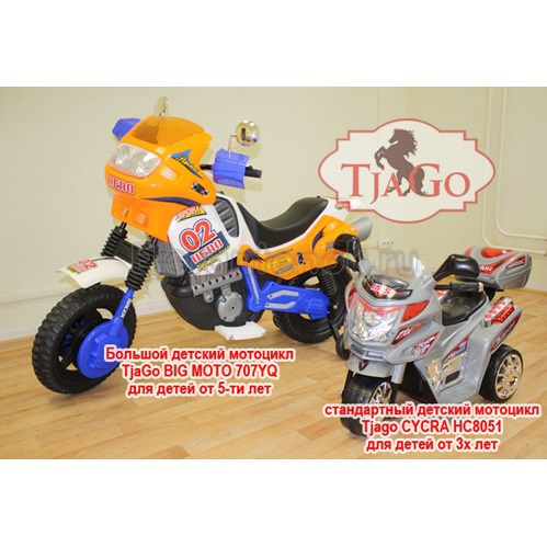 Аккумуляторный электромотоцикл TjaGo Big Moto предназначен для детей от 5-ти до 8 лет. Ребёнок с удовольствием будет управлять транспортным средством, которое приводится в движение путём нажатия на педаль, а чтобы притормозить, потребуется отпустить педаль. Электромотоцикл позволит получить Вашему ребенку незабывемые ощущения от поездок, ведь он оснащен звуковыми и световыми эффектами, фарами как у настоящего мотоцикла и сигналом. Для контроля дороги сзади есть зеркала заднего вида.